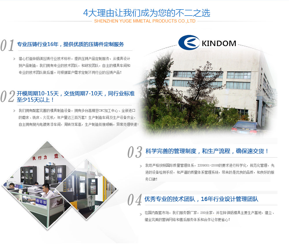公司坐落在美麗的觀潮勝地海寧連行經(jīng)濟(jì)開發(fā)區(qū)內(nèi),距杭州18公里,緊靠杭州繞城高速(G2501)下沙出口,距江東汽車產(chǎn)業(yè)園10公里。公司占地面積33000平方米,廠房建筑面積15050平方米。擁有各種高低噸位的著名品牌壓鑄件15臺(其中800T壓鑄機(jī)2臺、500T壓鑄機(jī)2臺、280T壓鑄機(jī)5臺、135T壓鑄機(jī)6臺),還有高精密自動(dòng)沖床、高精密度多軸鉆床、切邊機(jī)、表面處理等設(shè)備20余臺。公司擁有三坐標(biāo)測量儀、光譜分析儀、硬度拉力試驗(yàn)機(jī)等精密計(jì)量檢測設(shè)備。